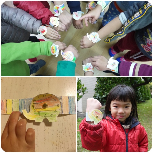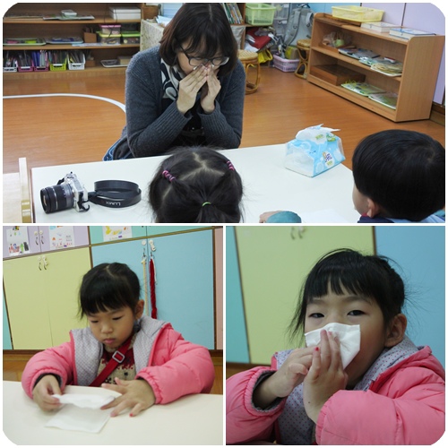 在教小朋友們如何摺衛生紙擤鼻涕。(這的確很重要)