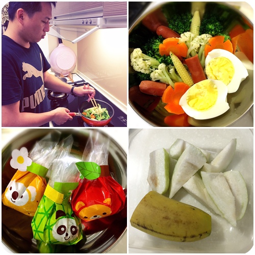 老母很奸巧,準備了可愛包裝紙來包飯糰,再配上一些蔬菜和水果就完成了。