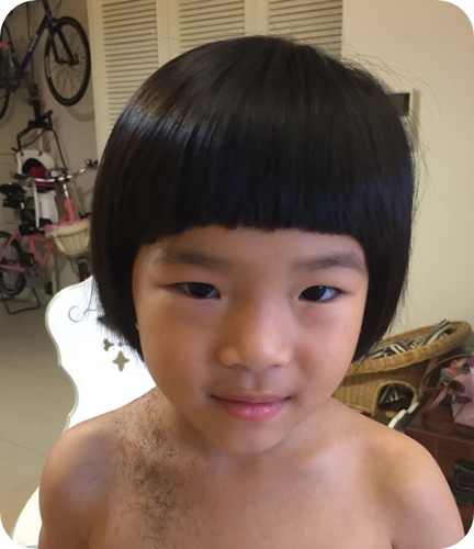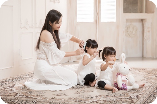 然後調整女兒位置、道具兔擺好(自帶),然後說:來梳頭髮囉~